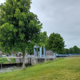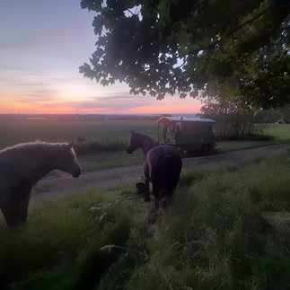 Ce matin, le temps est gris et froid, nous traversons un pont écluse, encore une gageure pour Idaho, puis contournons la baie par la seule route disponible, une grande route heureusement doublée par une piste cyclable étroite. C'est un moment pénible, les camions et voitures incessants nous frôlent, nous en sortons enfin pour trouver le calme d'un petit village dans un camping abandonné, en croisant les chevaux emblématiques de la baie, les chevaux de Henson.